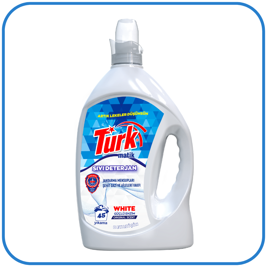 TÛRKMATİK Liquid Detergent for Whites perfectly protects and brightens your white clothes. Thanks to its special formula, it ensures that your whites remain fresh and vibrant in every wash without losing their first day shine.
